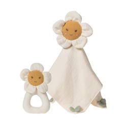 Hochet en forme de fleur marguerite, conçu pour la puériculture et la vente en rayon bébé. Format compact (17 x 10 x 2 cm) facile à présenter en gondole ou en présentoir. Construction principalement tissu rembourré et anneau souple, offrant une prise en main aisée pour les bébés. Design doux et neutre, adapté aux collections naissance et cadeaux. Argument commercial : produit léger, attrayant en photo, simple à stocker et à valoriser en offre naissance.