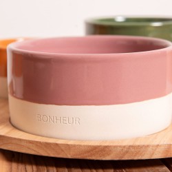 Chaque bol arbore une finition bicolore avec un intérieur coloré (rose, orange, vert, pêche) et un extérieur crème, accompagné d’inscriptions en français évoquant des valeurs positives telles que « BONHEUR », « MOMENT », « PARTAGE » et « DETENTE », apportant une touche chaleureuse et conviviale à votre table.