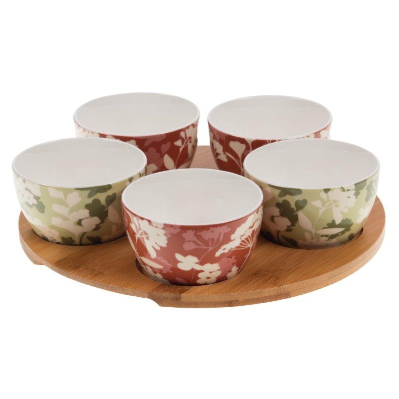 Élevez vos apéritifs avec élégance grâce au service Isana. Ce coffret comprend 5 bols en porcelaine fine New Bone China, ornés de délicats motifs floraux rouges et verts. Chaque bol s’installe sur un plateau en bois naturel, idéal pour présenter vos amuse-bouches avec style et convivialité. Raffiné et pratique, ce service transforme vos moments de dégustation en instants élégants et partagés.