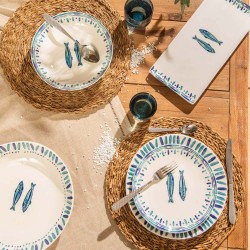 La collection Kyanos de Table Passion invite à un voyage en bord de mer. Réalisée en faïence, elle se distingue par ses motifs de poissons stylisés et ses nuances de bleu profond qui évoquent la Méditerranée. Assiettes, plats et saladiers apportent fraîcheur et authenticité à vos repas, parfaits pour des tables estivales et conviviales. Une gamme qui respire l’air marin et sublime vos moments de partage.