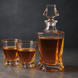 La carafe, au design épuré et à la base sculptée en forme de torsade, permet une prise en main agréable tout en offrant une esthétique unique qui capte la lumière avec élégance. Les verres, aux formes harmonieuses et aux détails torsadés évoquant le mouvement, complètent parfaitement cette pièce maîtresse, idéale pour servir whisky, spiritueux, ou eaux aromatisées.