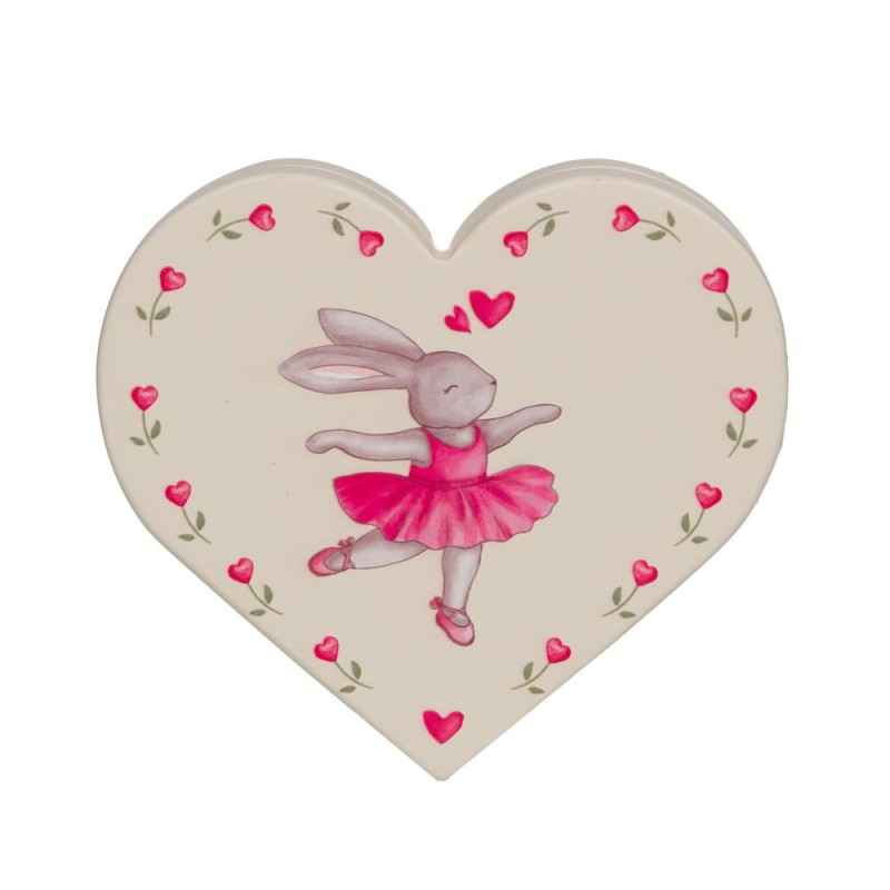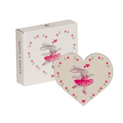 Craquez pour cette adorable boîte à quenottes en forme de cœur signée Amadeus, pensée pour conserver précieusement les petites dents de lait de votre enfant. Réalisée en MDF, elle séduit par son design poétique et délicat : un charmant lapin danseuse entouré de petites fleurs apporte une touche tendre et féerique à l’ensemble.