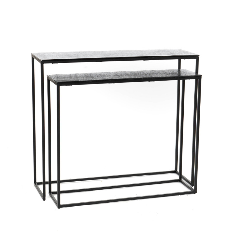 Apportez une touche contemporaine et raffinée à votre intérieur avec ce set de 2 consoles en fonte d’aluminium finition noire irisée. Leur design minimaliste, souligné par une structure fine en métal et des plateaux texturés, allie élégance et modernité. Fonctionnelles et décoratives, elles se glissent facilement dans une entrée, un salon ou une chambre pour mettre en valeur vos objets, luminaires ou accessoires déco. Pratiques grâce à leurs deux dimensions complémentaires (petit modèle 25x90x75 cm, grand modèle 30x100x85 cm), elles peuvent s’utiliser ensemble ou séparément selon vos envies. Un duo chic et intemporel qui sublime tous les styles de décoration.