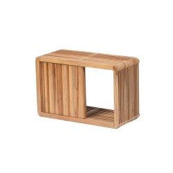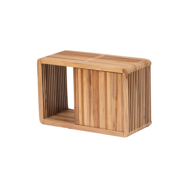 Réalisée en teck recyclé, elle met en valeur les nuances authentiques du bois tout en s’inscrivant dans une démarche écoresponsable. Sa structure légère et graphique, associée à un plateau supérieur fonctionnel, en fait une pièce aussi esthétique que pratique.