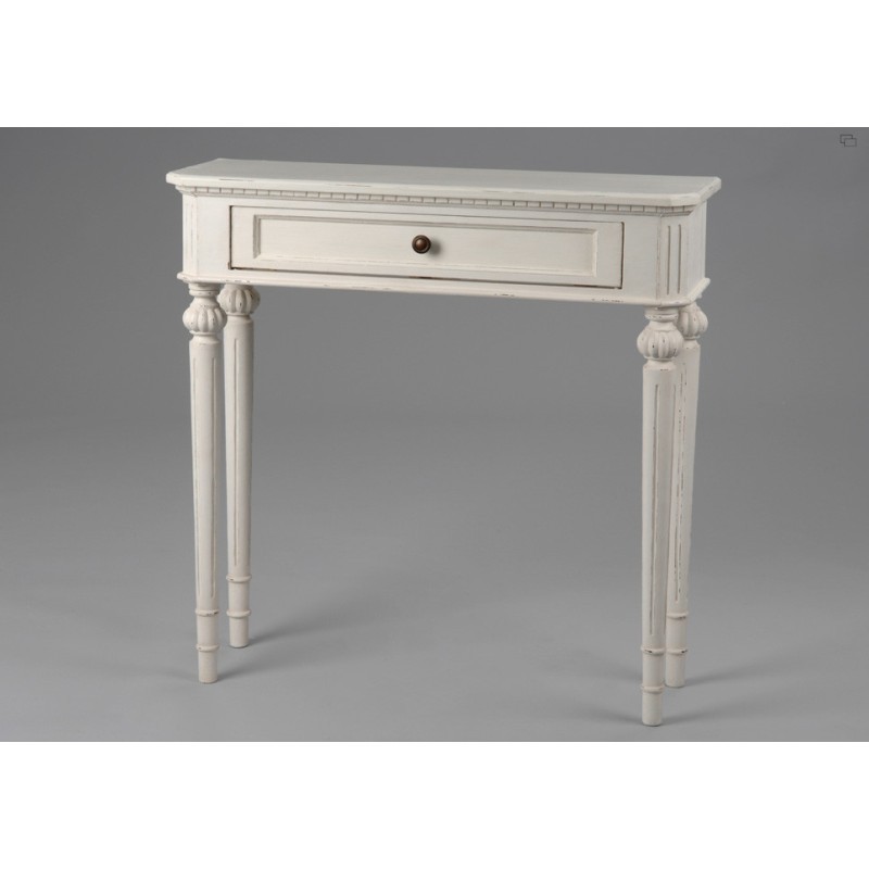 Apportez une touche d'élégance classique à votre intérieur avec cette console blanche patinée. Son tiroir pratique accueille vos petits objets tandis que ses lignes fines et ses pieds sculptés créent une ambiance douce et raffinée, parfaite pour un coin lecture ou une entrée accueillante.