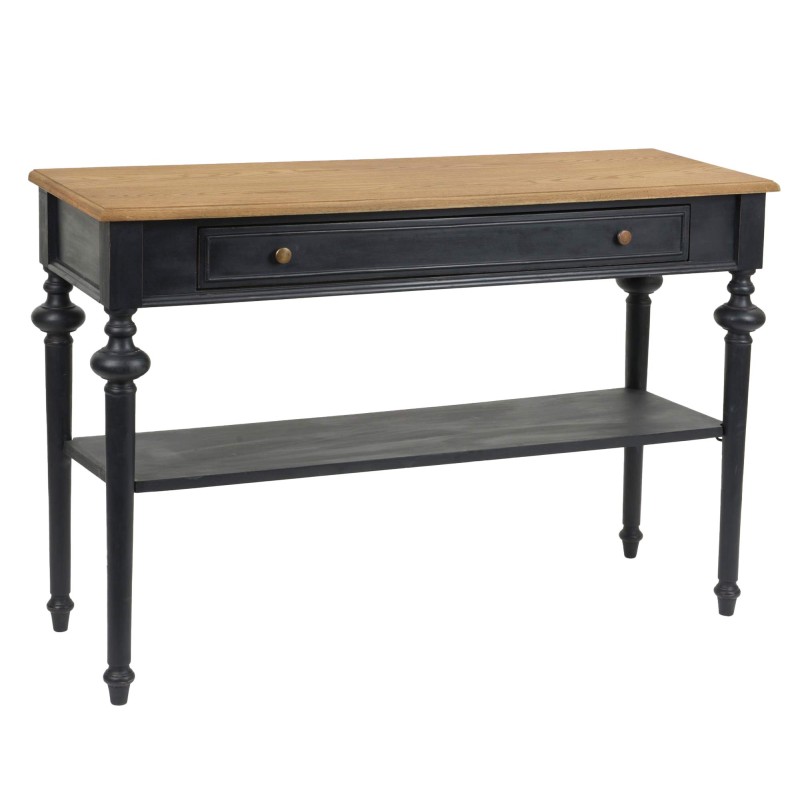 formidable mélange des genres, la console new légende fabriquée en bois de chêne et en panneaux de fibres à moyenne densité mêle une silhouette rustique à un superbe noir profond. hautement pratique, celle-ci comporte un niveau ainsi qu'un vaste tiroir. meuble livré démonté, à assembler soi-même.