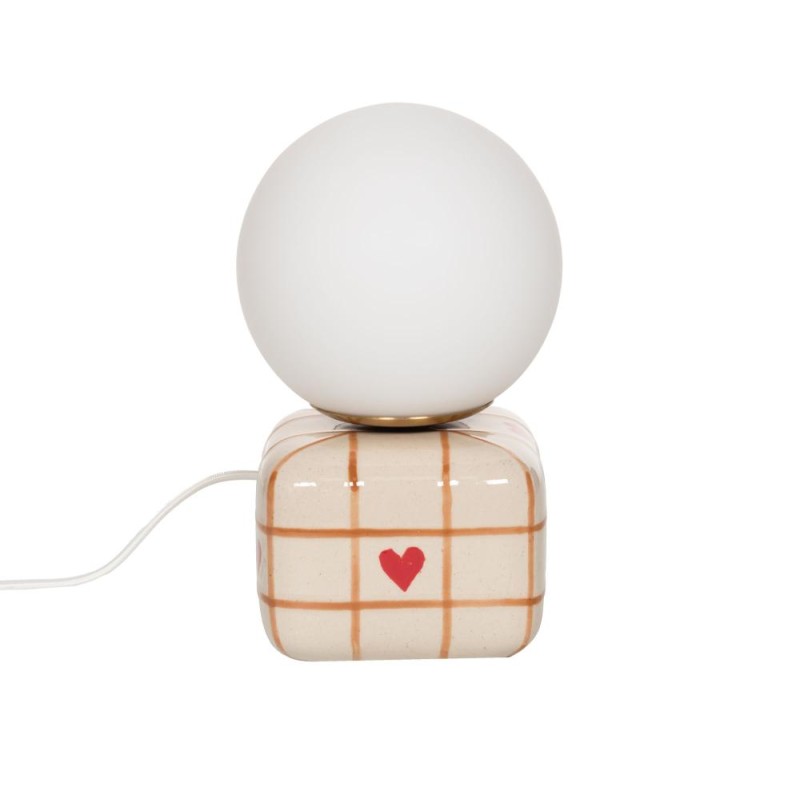 Apportez une touche de douceur et de romantisme à votre intérieur avec la lampe de chevet Maya Cœur. Son socle en céramique, orné d’un motif quadrillé crème et d’un délicat cœur rouge, séduit par son style tendre et décoratif. Surmontée d’un globe opalin, elle diffuse une lumière douce et apaisante, idéale pour une chambre, un coin lecture ou une ambiance cosy. Compacte et facile à intégrer (15x15x25 cm), elle constitue aussi une jolie idée cadeau, à la fois charmante et tendance. Existe en différents modèles.