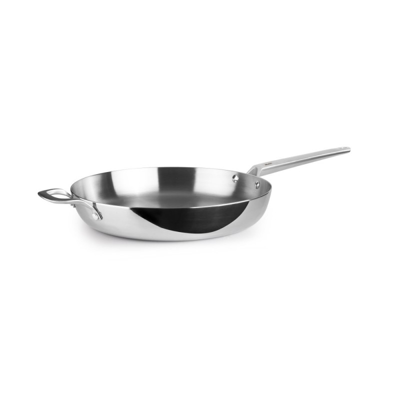 Poêle 5 couches (5-ply) diamètre 32 cm, conçue pour une diffusion thermique homogène et une cuisson professionnelle. Construction multi-couches combinant inox et noyau conducteur pour performances énergétiques optimisées et compatibilité tous feux (induction incl.). Poignée rivetée ergonomique en métal pour une prise sûre et anse d'appui pour manutention facilitée. Article robuste, durable et valorisant pour un catalogue cookware haut de gamme.