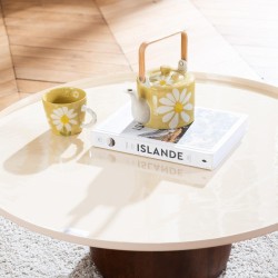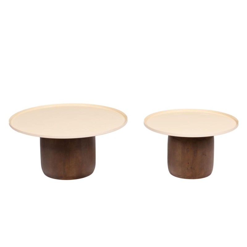 Tables basses assorties à l'unité, design contemporain combinant plateau clair et piétement massif bois foncé. Deux hauteurs complémentaires favorisent les ventes additionnelles (mise en scène, offres 2 pièces). Dimensions pratiques (Ø61 cm, H37 cm) pour valorisation en catalogue mobilier. Produit facile à photographier, stable et adapté à diverses ambiances (salon, coin détente). Argument commercial : look chaleureux, bonne aptitude à l'up-sell et présentation en pack merchandising.