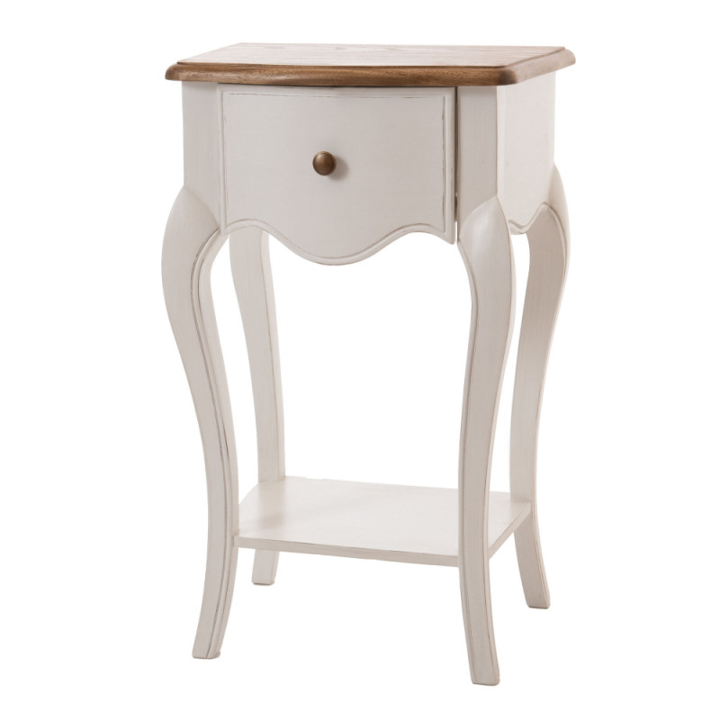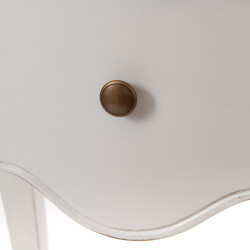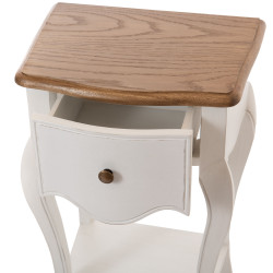 Apportez une touche d'élégance classique à votre chambre avec ce chevet Loberon. Son plateau en bois naturel et sa structure blanche aux courbes délicates créent une ambiance douce et raffinée. Pratique avec son tiroir et sa tablette, il organise vos essentiels tout en sublimant votre décoration.