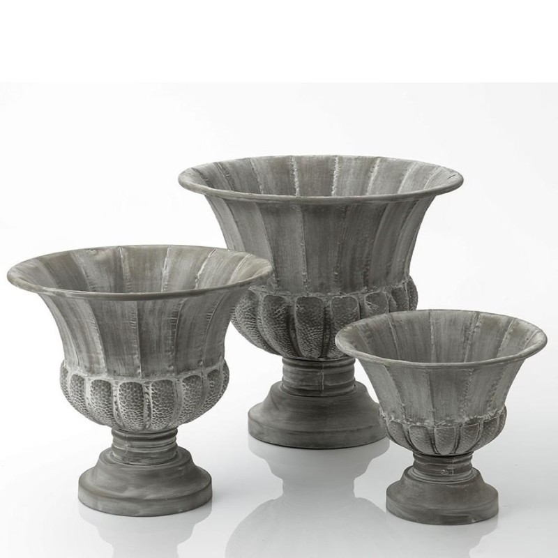 Apportez une touche d'élégance classique à votre intérieur avec ce set de 3 vases Médicis bas en métal gris. Leur silhouette raffinée et leur finition patinée créent une ambiance chic et intemporelle, idéale pour sublimer vos plantes ou compositions florales. Un trio décoratif qui habille avec style votre salon ou votre entrée. Dimensions : (PxLxH) Petit Modèle : 40/40/34 cm, Moyen Modèle : 53/53/46 cm, Grand Modèle : 62/62/57 cm.